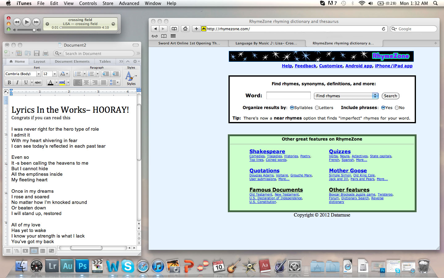 Workspace. Very important. I close all other programs that I'm not using and keep everything organized. Bring up the 2-3 lyrics in a internet window (I usually have them as tabs), your word doc., and itunes/youtube video. I use RhymeZone.com to find rhymes when I'm making lyrics. Rhyming isn't 100% necessary but I find it makes the song flow better. More on that later. It might also be a good idea to have a dictionary/thesaurus up to, you know, memorize when you're bored.